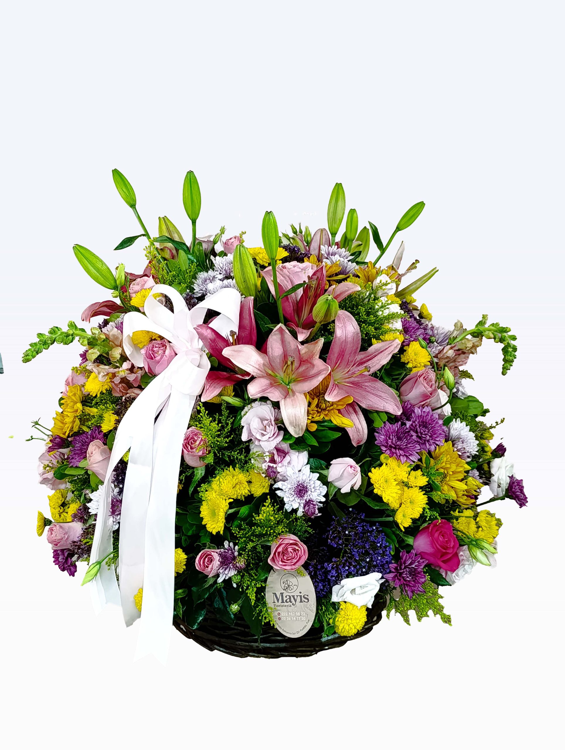 Canasta mediana de varas con lisianthus, perro, lilis, margaritas, rosa, dólar y follaje ideal para regalar en cumpleaños, aniversarios, buenos deseos de salud, graduaciones, etc.