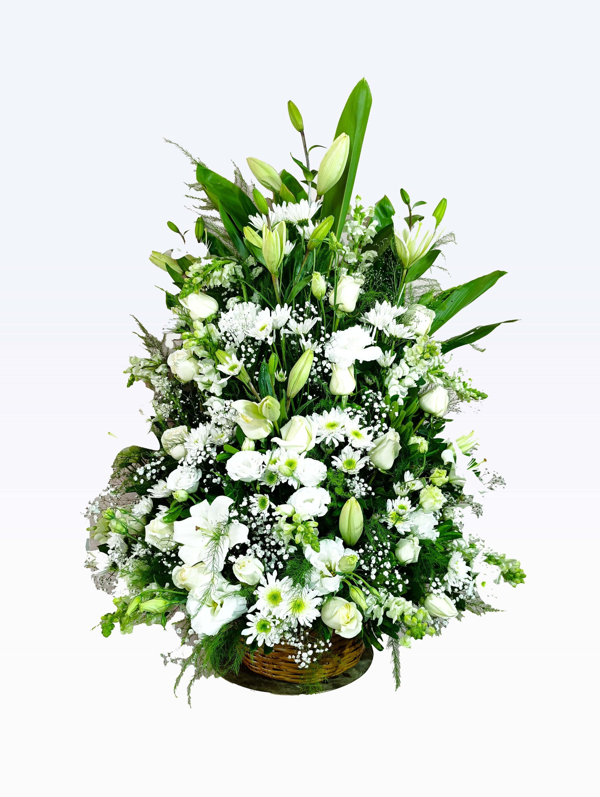 Arreglo de una vista para celebraciones fúnebres con lilis, rosa, lisianthus, margaritas, perro con follaje.