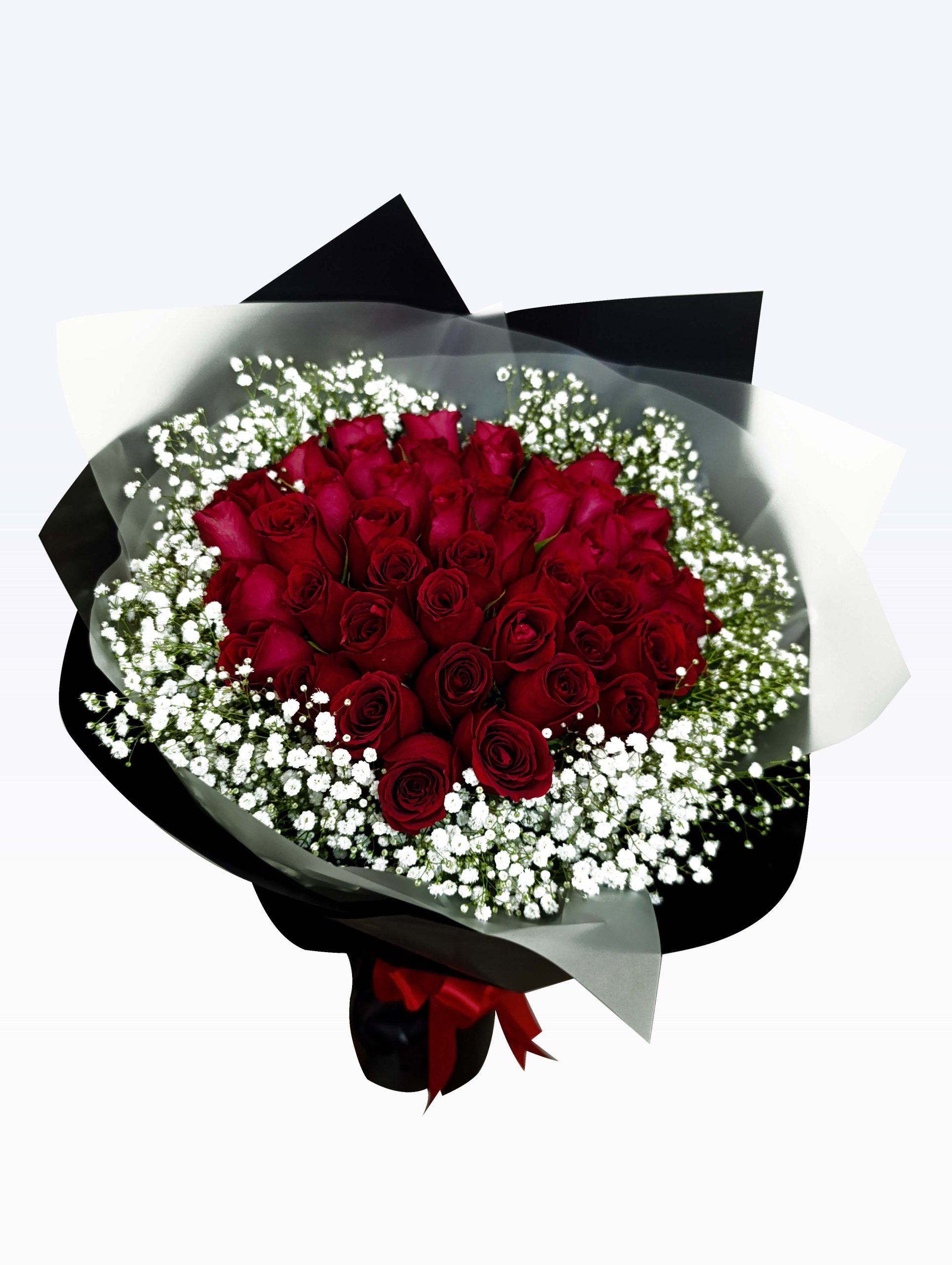 Ramos de 50 rosas rojas, baby con papel negro y blanco.