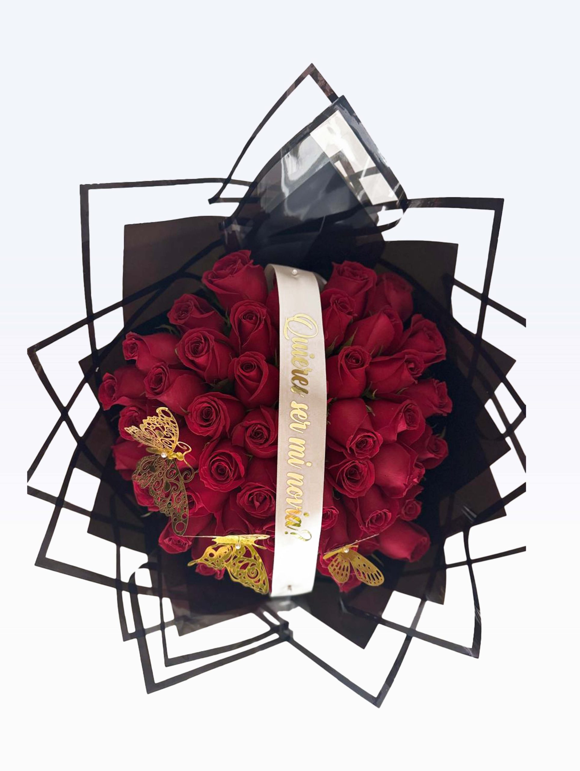 Ramo de 48 rosas rojas con mariposas y mensaje.
